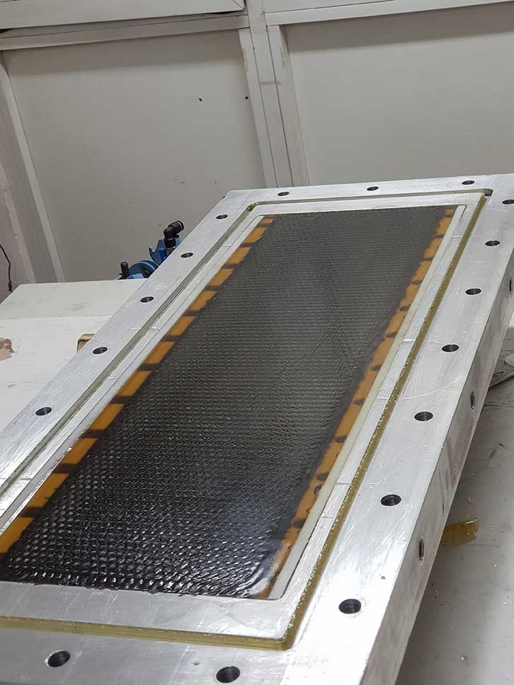 3D kompozit üretimi için 3D dokunmuş ön şekil desen yazılımı, ön şekil üretimi ve RTM kalıp tasarımı bir bütün olarak tasarlanması gereken proseslerdir. RGK (reçine geçişli kalıplama) prosesinin kalıplarının tasarımı firmamız bünyesinde ön şekillerin ve reçine sistemlerinin teknik özelliklerine göre yapılmaktadır. Firmamız, 3B dokunmuş kompozit üretimine göre özelleştirilmiş RGK sistemi ile ön şekilleri kompozit haline getirme kabiliyetine sahiptir.